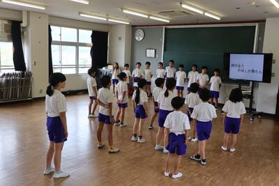 9月17日の児童集会は、体験したことをわかりやすく伝えることをめあてに、「ドキドキ体験リレー」を行いました。なかよし班ごとに集まり、5・6年生がアーティストとの稲刈り体験を下級生に伝えました。次回は次の学年が体験を伝えます。