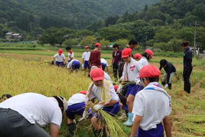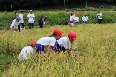 春に室牛で田植えをした稲が収穫の時期を迎えました。9月11日(木)、5・6年生は南野陽子さん他、アーテイストの皆さん、室牛地区の皆さんと一緒に稲刈りをしました。子どもたちは慣れた手つきでどんどんと刈っていきました。準備をしてくださった室牛地区の皆さんや舞鶴市役所の関係の皆さん、ありがとうございました。