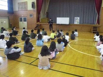 ナイフを持った不審者が校内に侵入したことを想定した避難訓練を実施しました。訓練では舞鶴警察署と校区の駐在所から警察官の皆さんに指導していただきました。児童は「いか・の・お・す・し」を再確認したり、教職員はサスマタの使い方を学んだりすることができました。