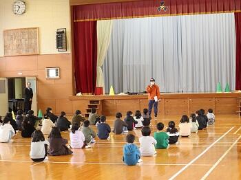 大地震により火災が発生した想定で避難訓練を行いました。今回は舞鶴市消防本部の消防士さんに御来校いただき、参観と評価をしていただきました。その後、3年生と6年生が起震車体験もさせていただきました。