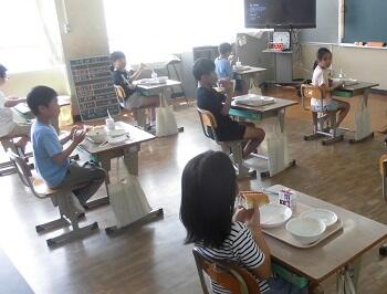 9月になりましたが、まだまだ残暑が厳しいようです。本日より給食が開始になりました。どの学級でもおいしい給食を笑顔で頬張っていました。