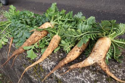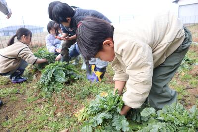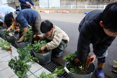 2月24日(月)、1・2年生が大浦校区の伝統野菜、佐波賀大根を収穫しました。種をまいてから約5か月。大きく成長した大根の収穫には苦戦していましたが、だんだんと上手に引き抜くようになりました。後日、給食のメニューになります。どんな料理になるか楽しみです。
