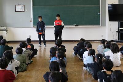 3月4日(水)は今年度最後の児童集会でした。各委員会からの振り返りのあと、クラスごとに1年間の反省をして発表しました。
